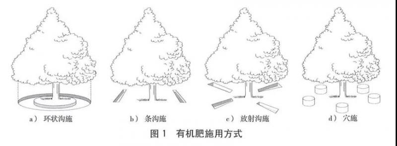 基肥可采用環(huán)狀溝施、條溝施放射溝施和穴施(圖1)以及地表覆蓋等方式進(jìn)行局部集中施用。追肥可采用條溝施、放射溝施或管道施等方式進(jìn)行。