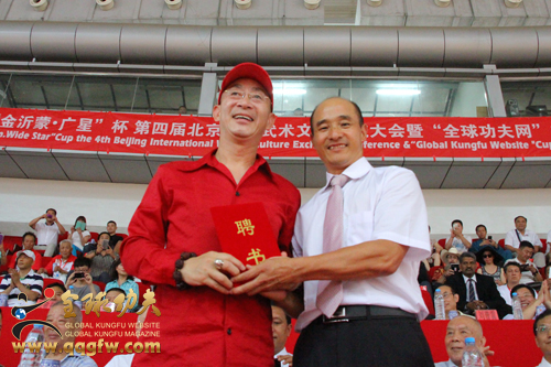 聯(lián)合國(guó)友好使者、中國(guó)武協(xié)副主席、國(guó)際功夫聯(lián)合會(huì)主席、北京國(guó)際武術(shù)文化交流大會(huì)組委會(huì)主席傅彪先生向六小齡童頒發(fā)武交會(huì)形象大使證書。