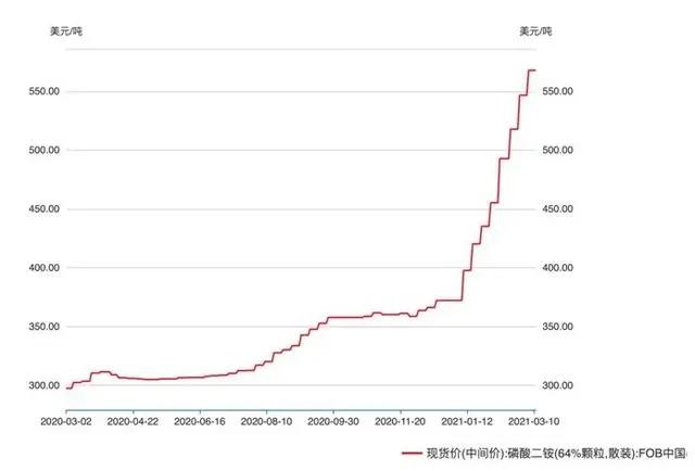 數(shù)據(jù)顯示,截至3月12日,由中國(guó)出口的磷酸二銨離岸價(jià)已連續(xù)上漲12周至580美元/噸,較去年同期上漲88.74%。